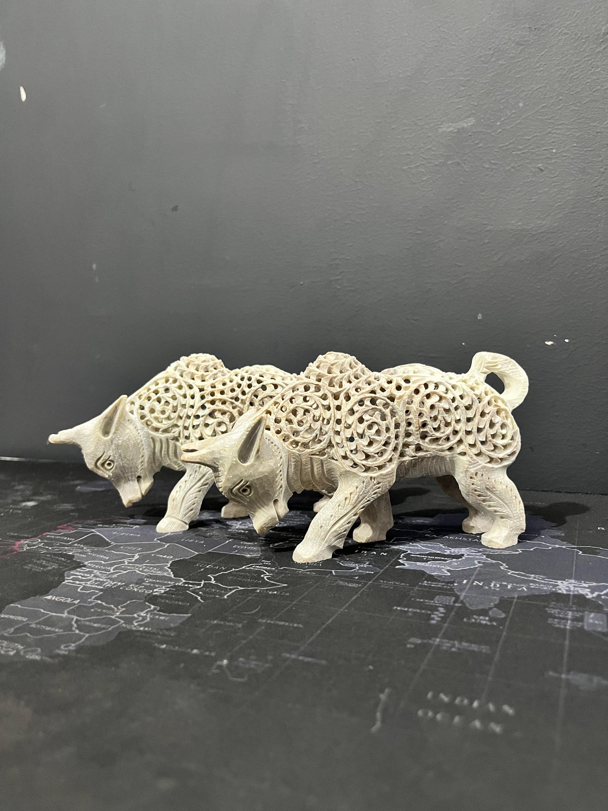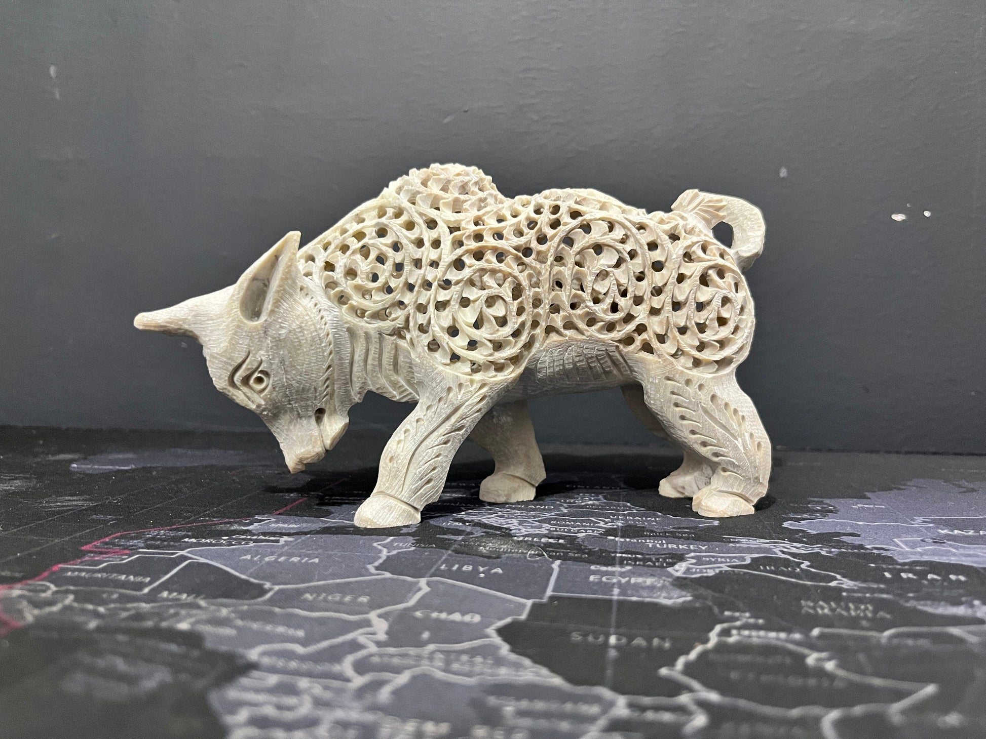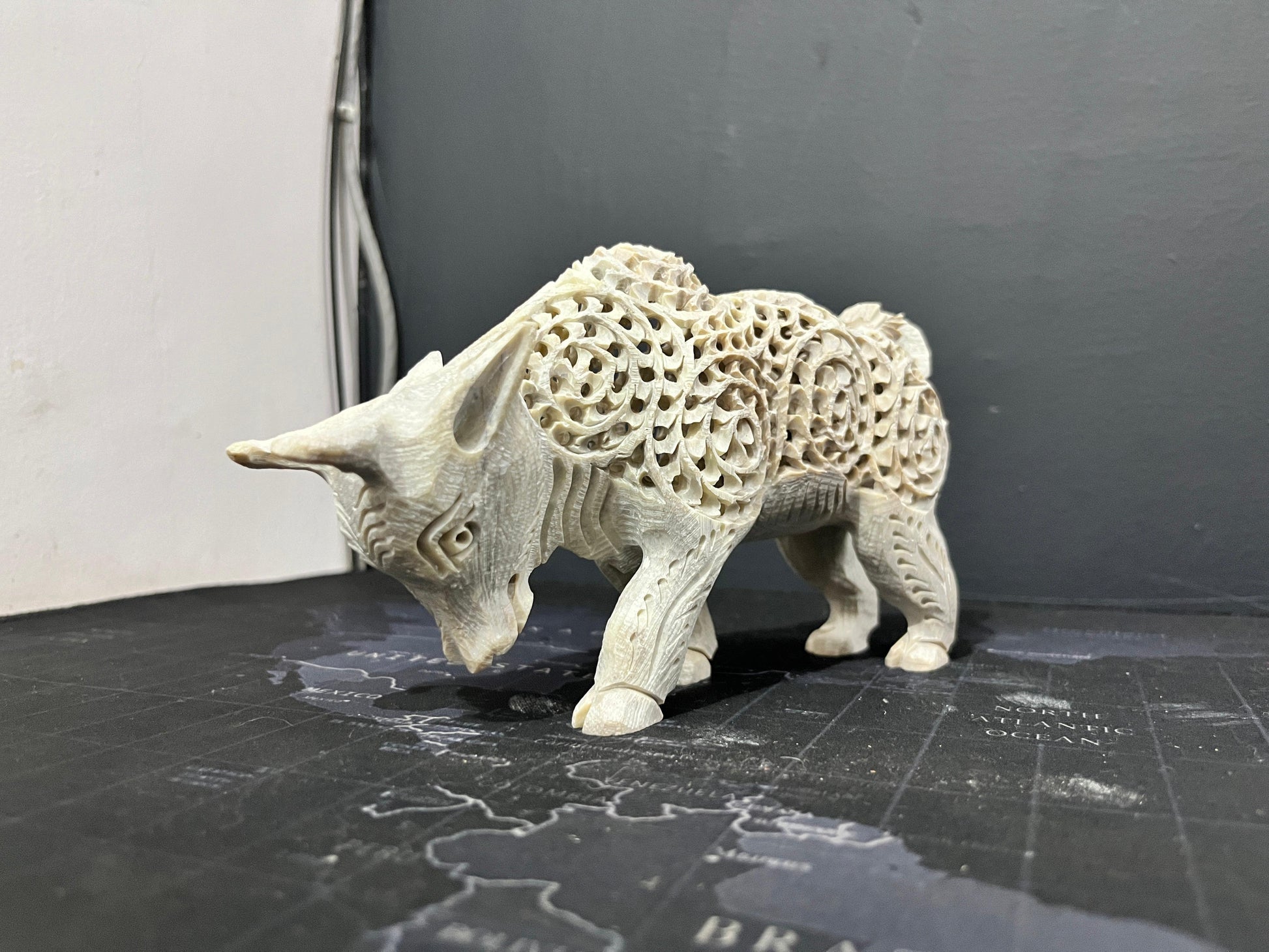 Craftsmanship: Unique "bull inside a bull" carving, showcasing intricate jali (lattice) work and fine detailing.