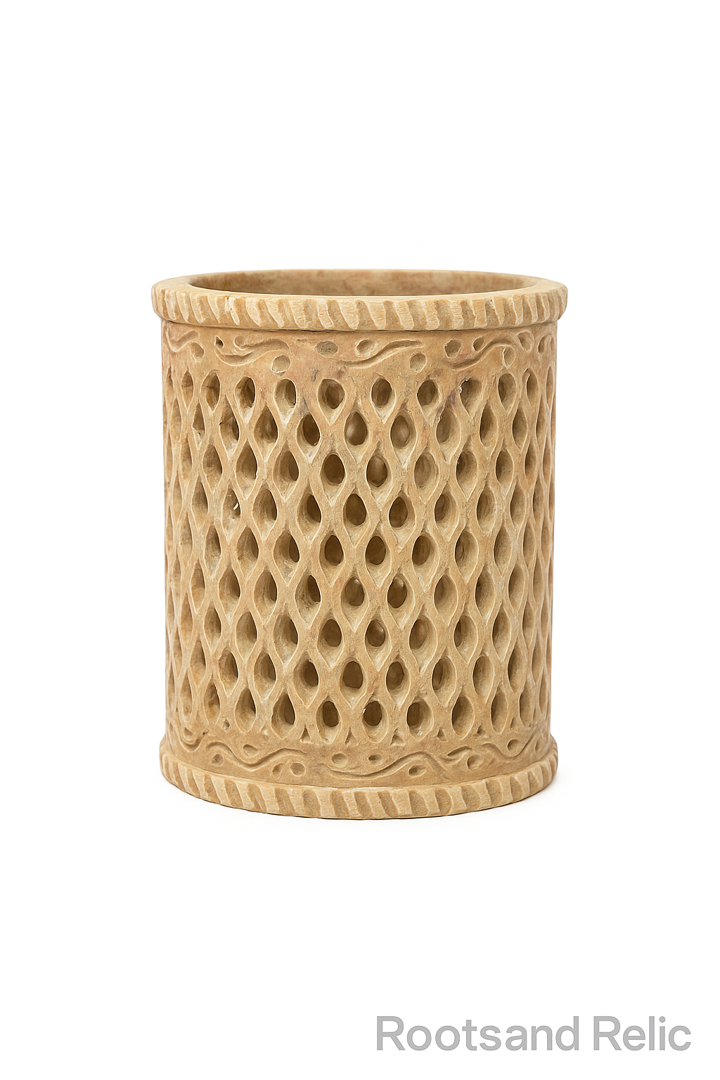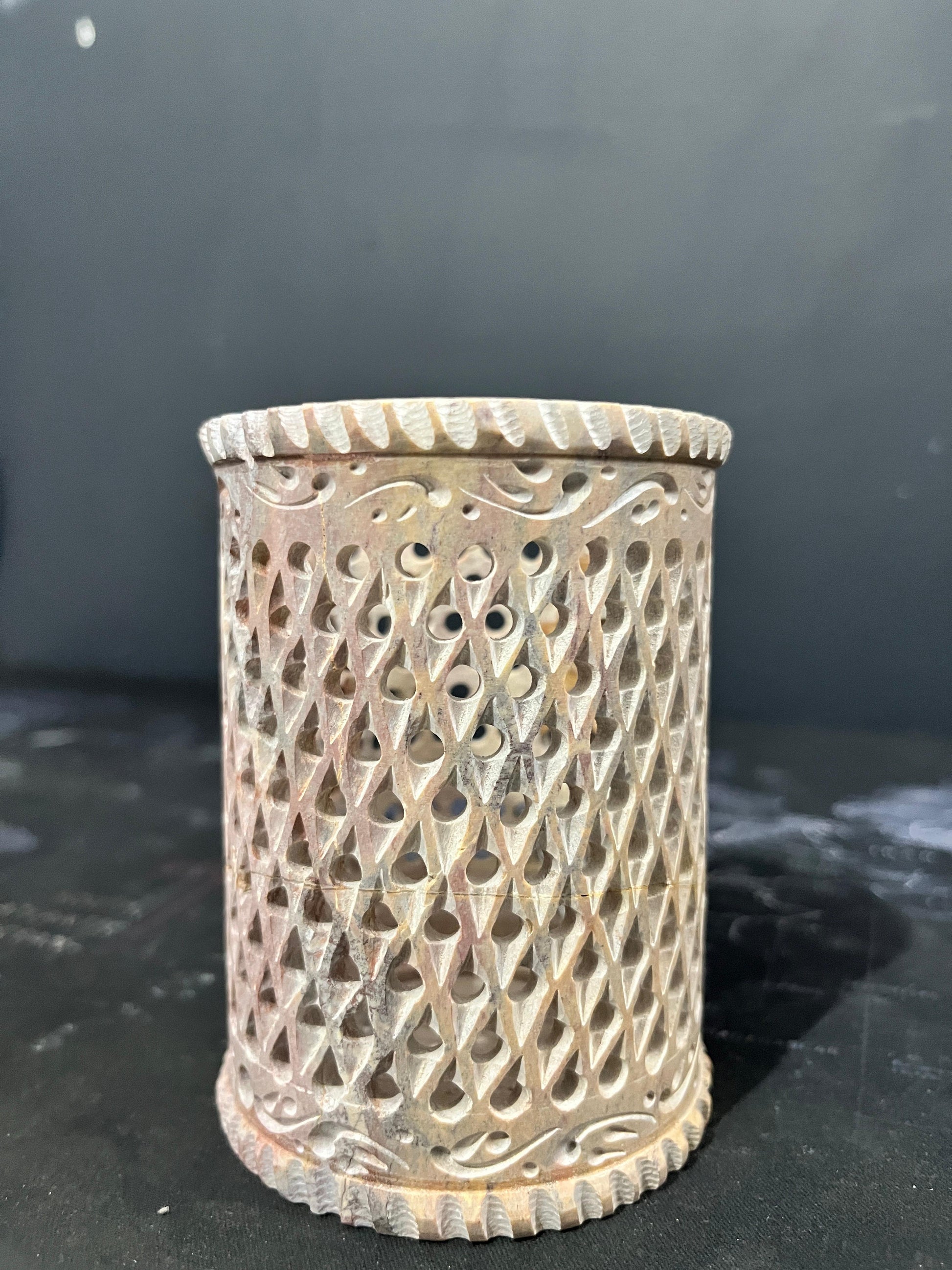 Add elegance and utility to your workspace with this handcrafted soapstone pen stand. Featuring intricate jali (lattice) carving, this piece is not just a desk accessory but also a beautiful work of art. Perfect for storing pens, pencils, makeup brushes, or even as a small decorative holder, it adds a touch of tradition and craftsmanship to your home or office.