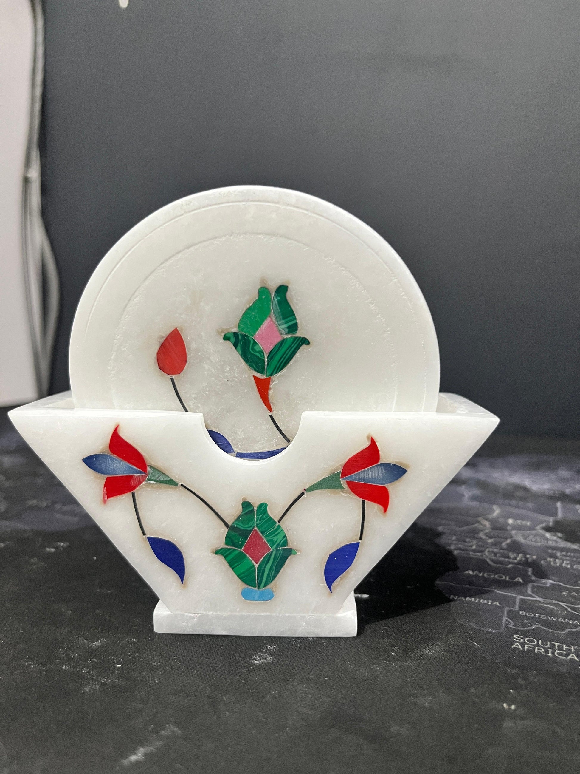 Add timeless elegance to your table with this hand-carved White Marble Tea Coaster Set. Each coaster is crafted with precision and decorated with delicate floral inlay work, showcasing traditional Indian artistry.